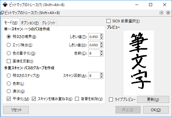 今回のサンプルや、きちんとした書道用の半紙に書かれたものをスキャンして取り込んだような画像であれば、特に値を変更する必要はないと思います。そのままダイアログ右下の「OK」ボタンを選択してください。
