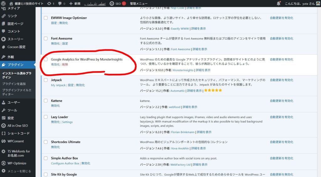 MonsterInsightsはAnalytics用のダッシュボードプラグインだったのですが、正直あまり見ていなかったので、もういいやと思ってプラグインを無効化し、削除しました。
