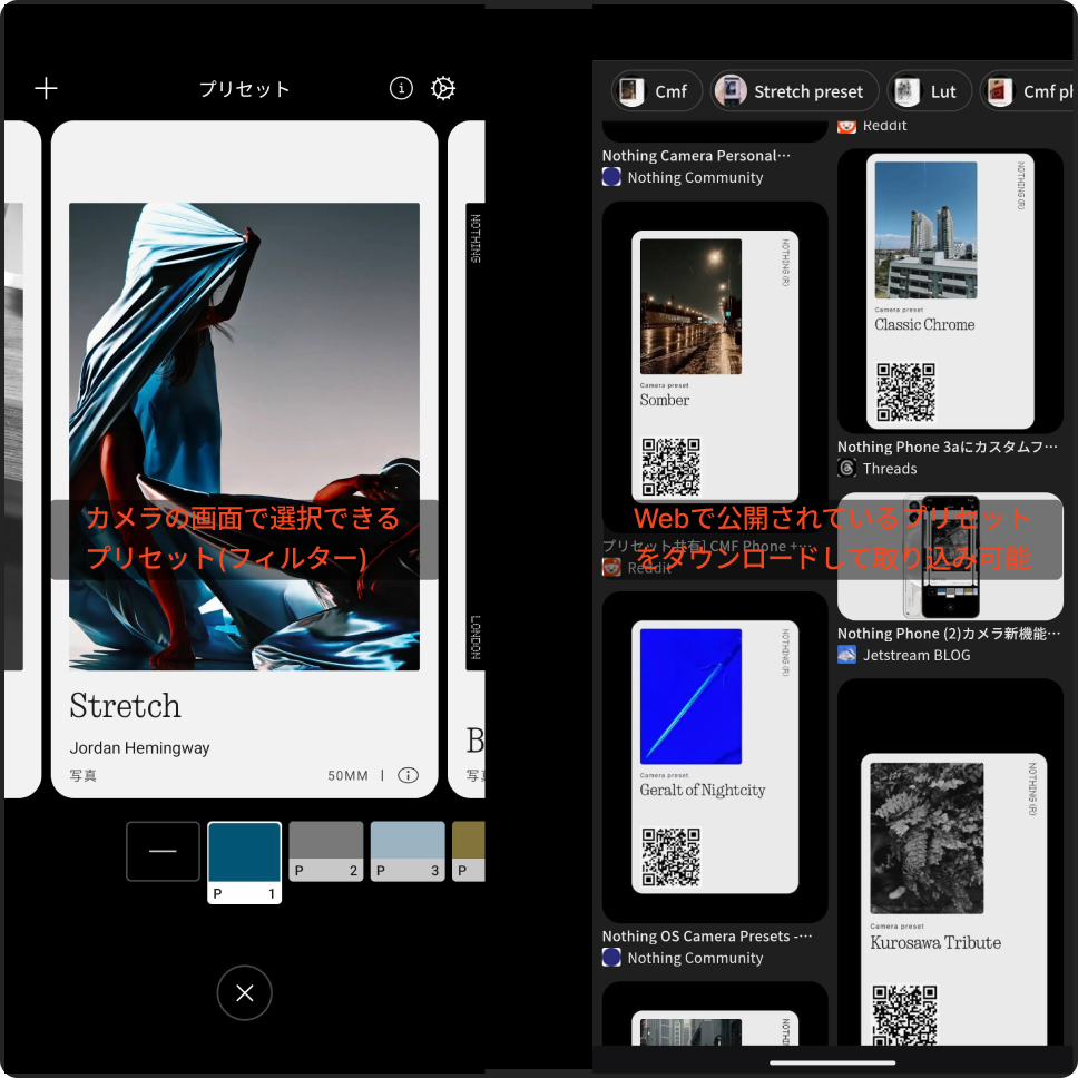 これは撮影時にフィルタを適用する機能で、それだけであれば他のスマホにもある機能になるのですが、Nothingの違うところは、このフィルタをみんながシェアできるようにしているところで、これにより映画をテーマにしたフィルタやフィルムカメラの質感を模したフィルタが様々な人の手により作られていてネット上でシェアされているので、Nothing Phoneの利用者は好みのフィルタを取り込んで自分のカメラの機能をパワーアップさせることができるんです。