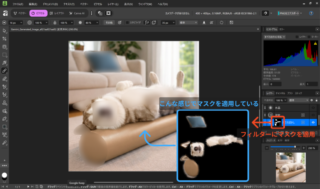 マスクとは、白と黒の濃淡でフィルターの効果の適用範囲をコントロールする機能です。