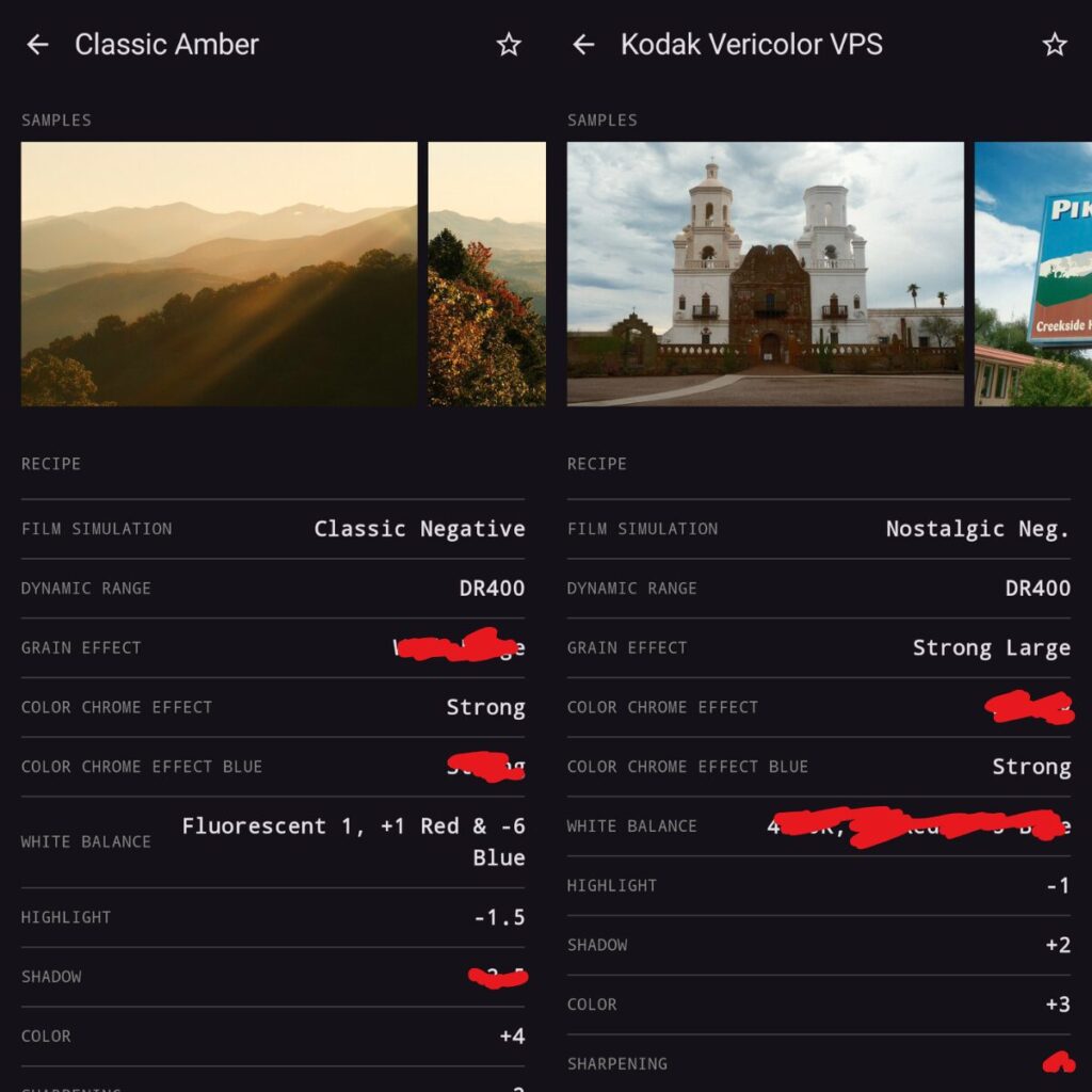 FUJI X WEEKLYというサイトが共有サイトとして有名で、各種設定を編集することで独自、あるいは他社のフィルムを再現した写りを作るレシピが多数共有されています。